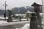 川沿いに並ぶ、雪の古い温泉街、静かに昇る湯気が情緒を高めます