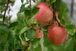雨に濡れるリンゴの枝、葉と実